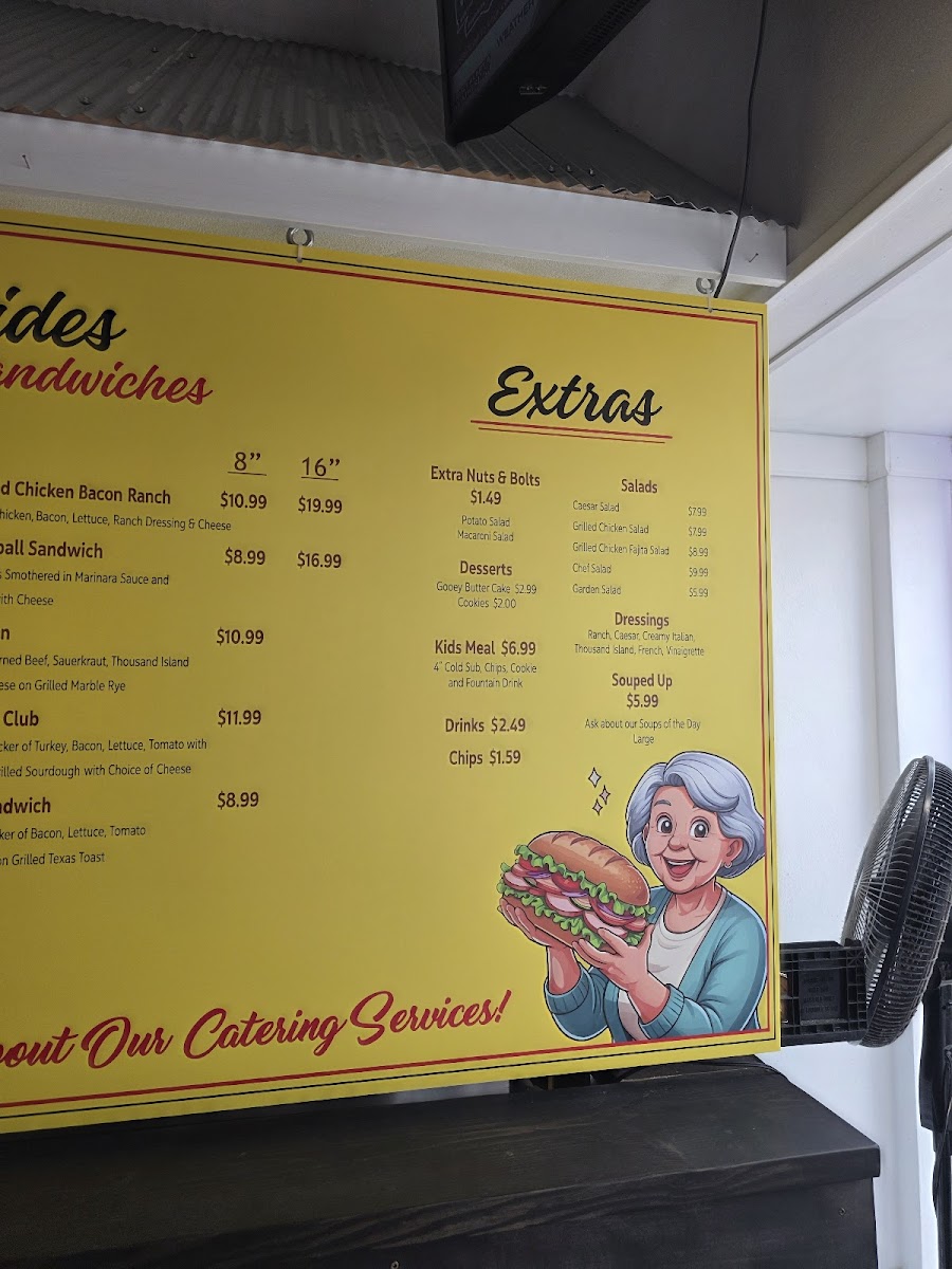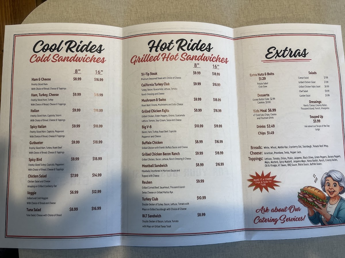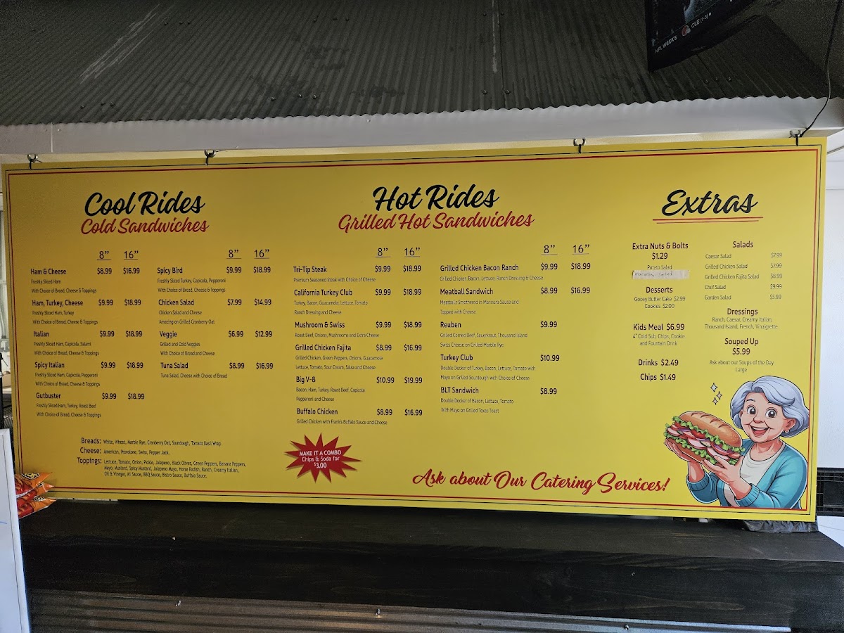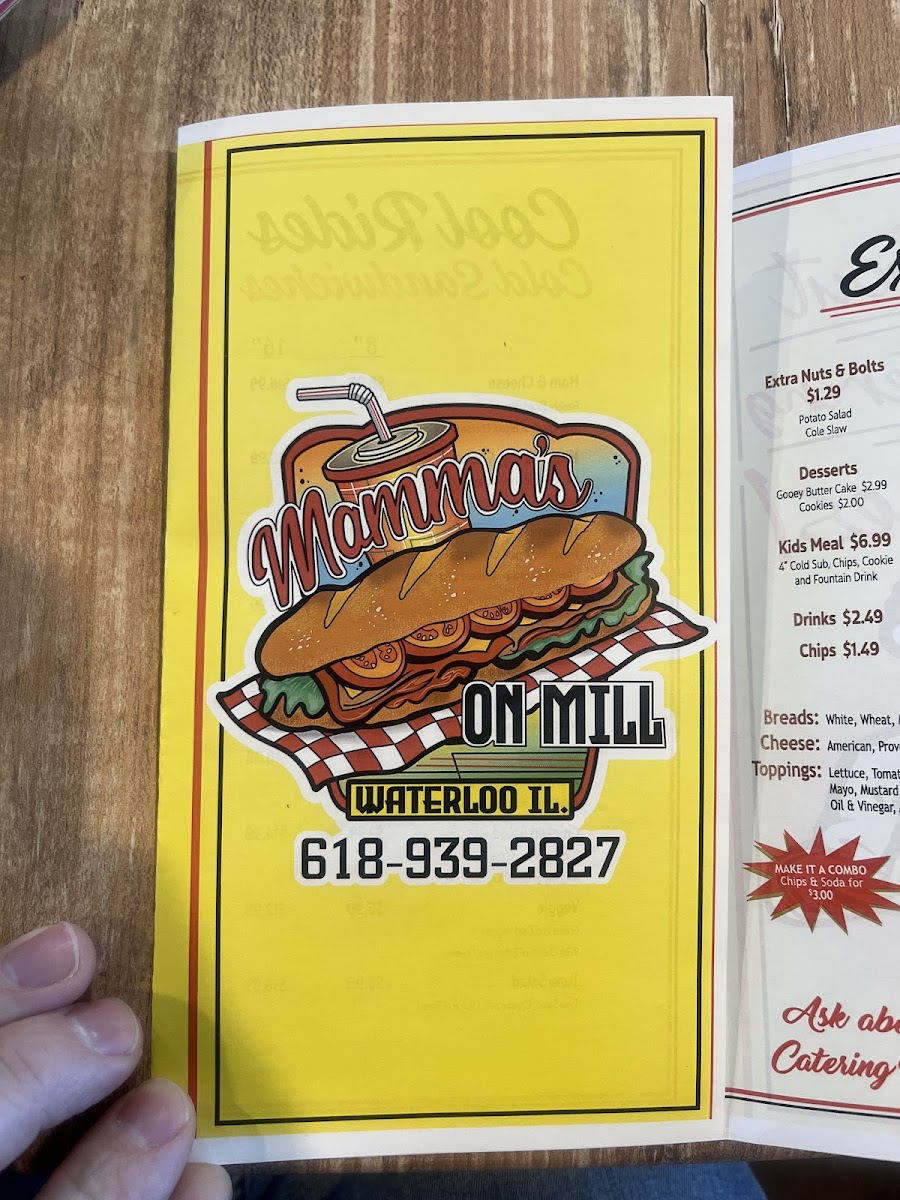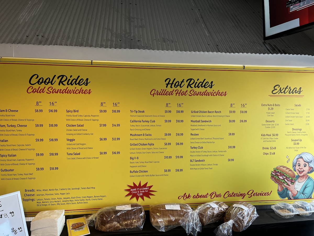 The menu at Mamma's On Mill offers a delightful mix of fresh, satisfying options suitable for a variety of tastes. For sides and desserts, guests can enjoy options like Chips, Potato Salad, and Macaroni Salad, with sweet treats such as Chocolate Chip Cookie and Double Chocolate Chip Cookie. The bread selection includes White, Wheat, Cranberry Oat, Marbled Rye, and Sourdough loaves, perfect for pairing with any meal. If you're craving something more substantial, the Soup of the Day and salads like Caesar Salad, Grilled Chicken Salad, and the flavorful Grilled Chicken Fajita Salad are great choices. The kids' menu offers a variety of options, from a Kids BYO Cold Sub Meal to Kids Spicy Italian Meal, all served in kid-friendly portions. For a heartier meal, Mamma's On Mill offers 8in Tri Tip Steak, 8in California Turkey Club, 8in Grilled Chicken Fajita, and 8in Buffalo Chicken among the Hot Rides, or opt for a Cool Ride like the 8in Ham & Cheese or 8in Italian. Drinks include Bottled Tea, Bottled Soda, and Life Water, perfect for refreshing yourself throughout your meal. Whether you’re grabbing a quick bite or sitting down to enjoy a hearty sandwich, Mamma’s menu delivers great taste at reasonable prices.